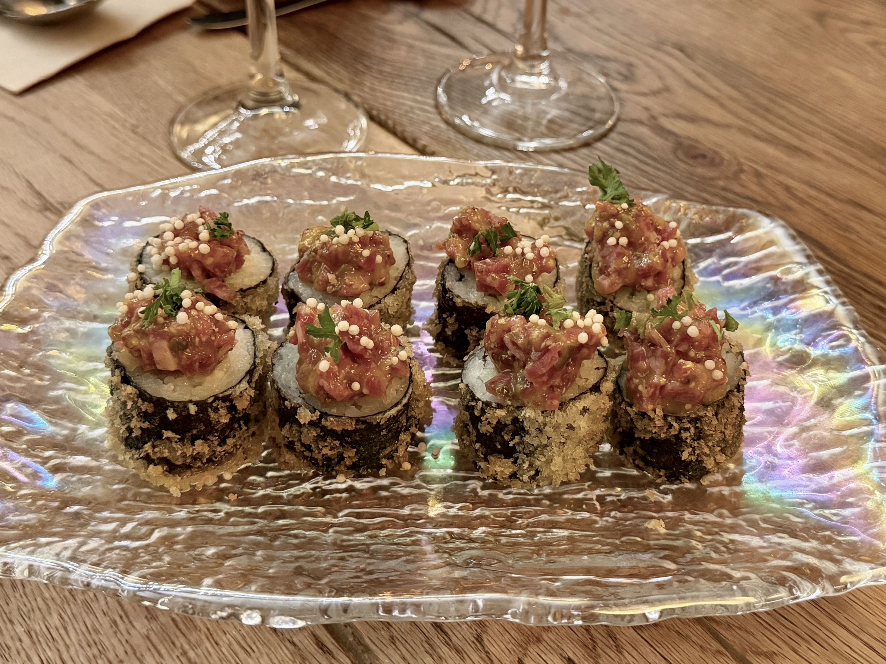 La nueva carta tiene platos que ya apuntan a convertirse en referencia. El Katsu Sando de atún rojo —con wakame, hoisin de fresa y mayonesa de trufa— aplica técnica japonesa a producto mediterráneo con un resultado que no se olvida. El taco de borraja en tempura con cochinita al estilo maya se mantiene como producto icono y además con premio. Los makis de fuet —forma japonesa, alma completamente aragonesa— demuestran que lo de aquí puede viajar sin perder el carácter. La berenjena asada en mantequilla de miso con crumble de cacahuete y champiñón laminado. El aguacate, intervenido por la llama con jamón, feta y tapenade. El calamar de anzuelo con romesco de sobrasada.